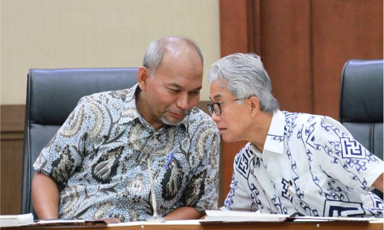 Head of upstream oil and gas authority SKK Migas, Dwi Sutjipto, engages in light conversation with Acting Director General of Oil and Gas, Djoko Siswanto, before the signing of two gross-split based Production Sharing Contracts (PSC) -- West Ganal and Pangkah Block on Friday (18/10). (Petromindo|Dasir)