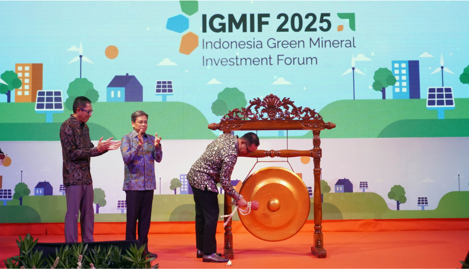 (Left to right) Nirarta Samadhi, Country Director of WRI Indonesia; Nurul Ichwan, Deputy Minister for Investment Promotion at the Ministry of Investment and Downstream Industry/BKPM; and Todotua Pasaribu, Vice Minister of Investment and Downstream Industry/Vice Chairman of BKPM, attend the opening of the Indonesia Green Mineral Investment Forum (IGMIF) 2025 at the Ministry of Investment/BKPM office, South Jakarta, Thursday (Oct. 2). (Lucky Ginting)