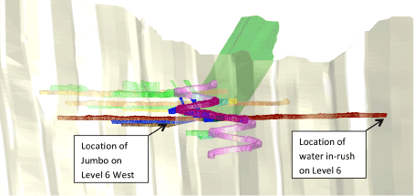 The company said in a statement that at a shift change on the evening of December 2, a large quantity of perched water was encountered following blasting of the Level 6 East ore drive. The main pumping system was able to cope with the brief water inflow, however water damage was sustained to the single boom jumbo drill rig stationed in the Level 6 bench cut and fill (BCF) drive in the west.