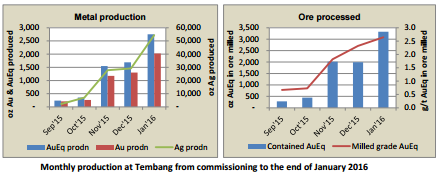During January 2016, the company processed 39,065 tons of ore at a grade of 2.65 g/t AuEq1 (1.81 g/t Au and 62.5 g/t Ag) at a recovery of 88.9% Au and 69.3% Ag to produce 2,750 gold equivalent1 ounces (2,025 oz of gold and 54,374 oz of silver).